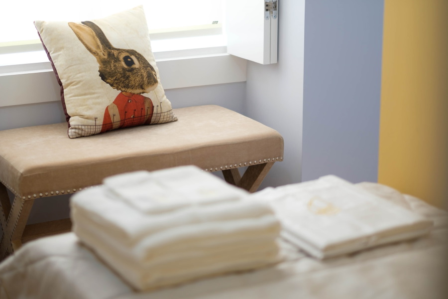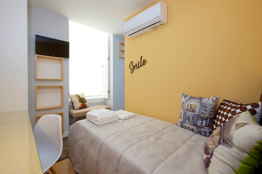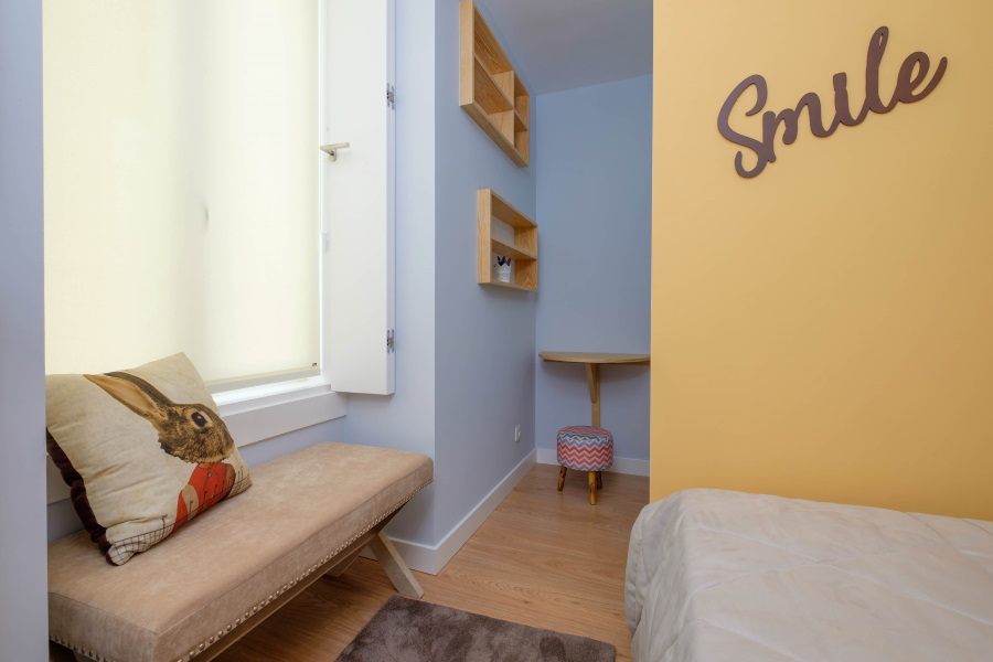 O Quarto tem uma grande janela voltada para a rua Eça de Queirós. Por baixo da janela, uma romântica banqueta, convida ao relaxamento e à contemplação do ambiente exterior.