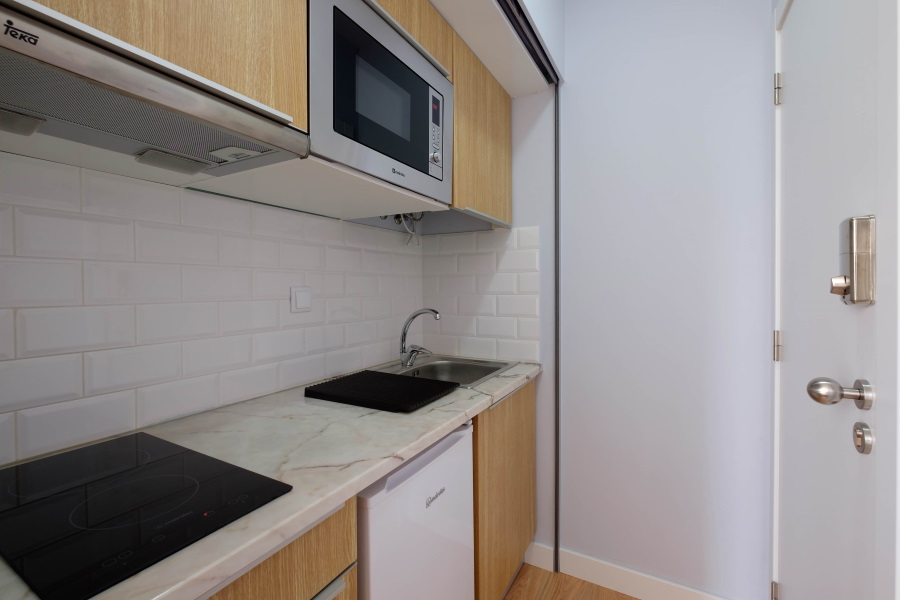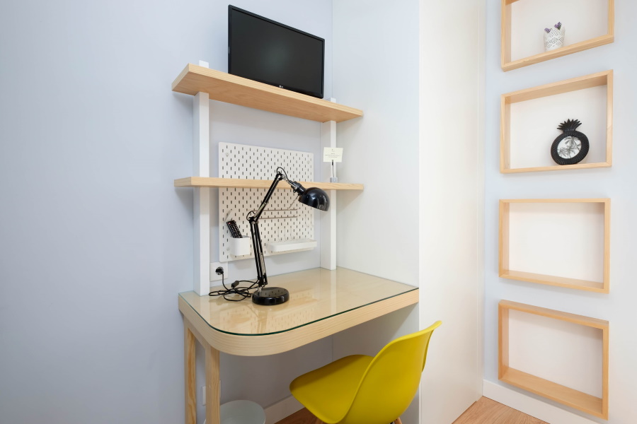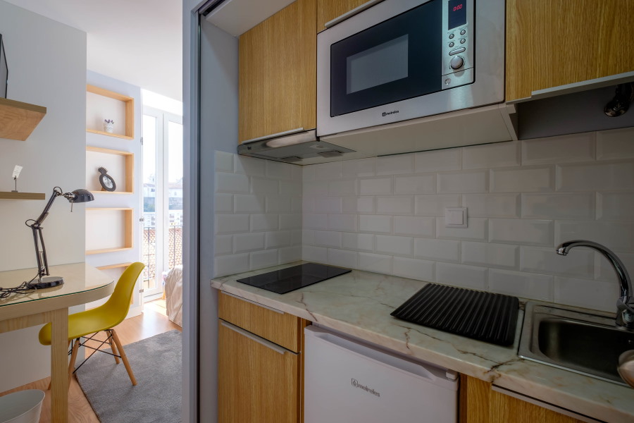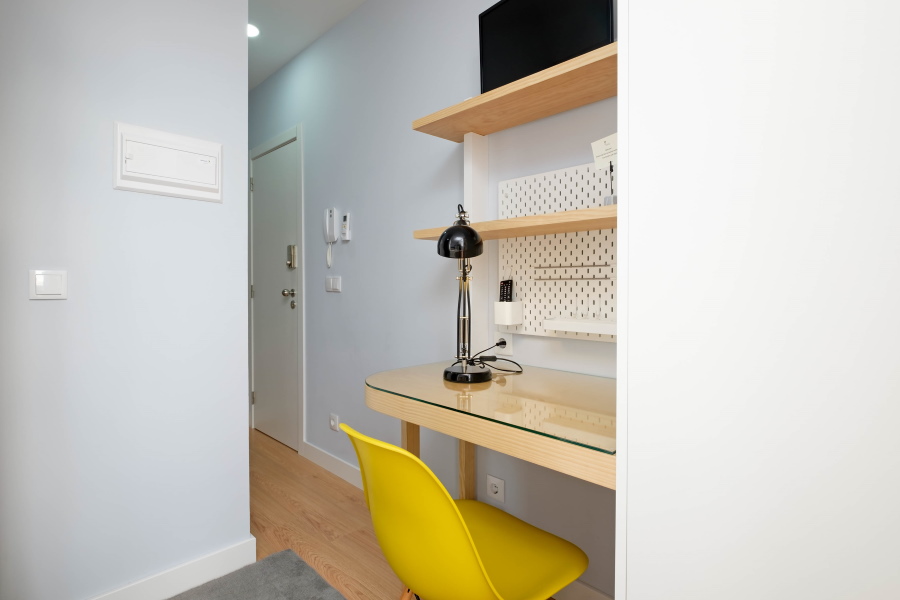 Beneficia da zona do quarto e secretária estarem isoladas da zona da Kitchenette.