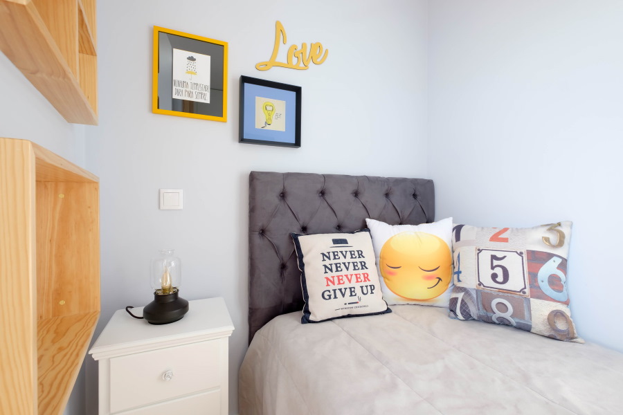 Nas paredes estão embutidos vários cubos de madeira natural, que para além de elementos decorativos, permitem a arrumação de livros e toda uma diversidade de objetos pessoais.