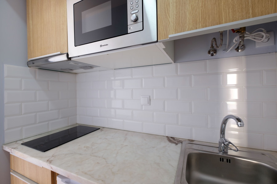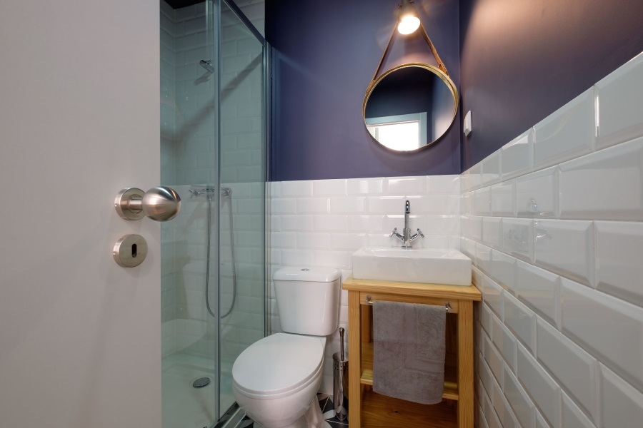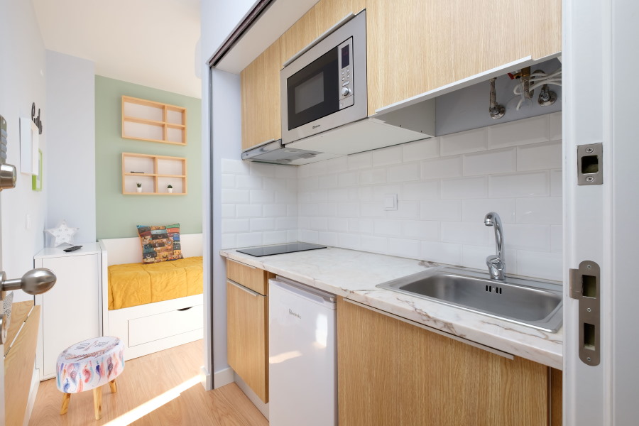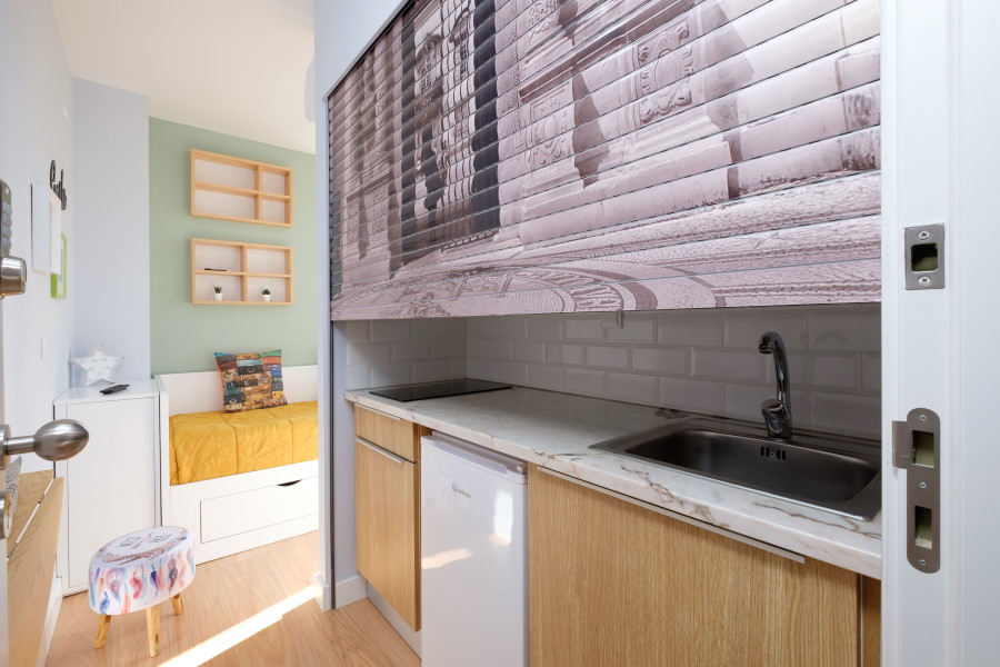 A Kitchenette pode ficar parcial ou totalmente “escondida” através de um sistema elétrico de persiana com decoração alusiva à cidade de Coimbra, basta carregar num interruptor.