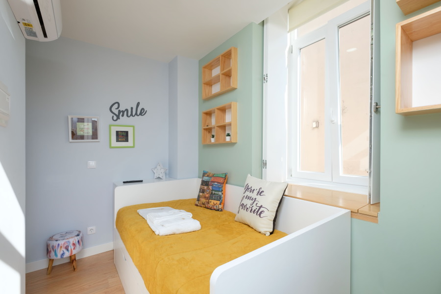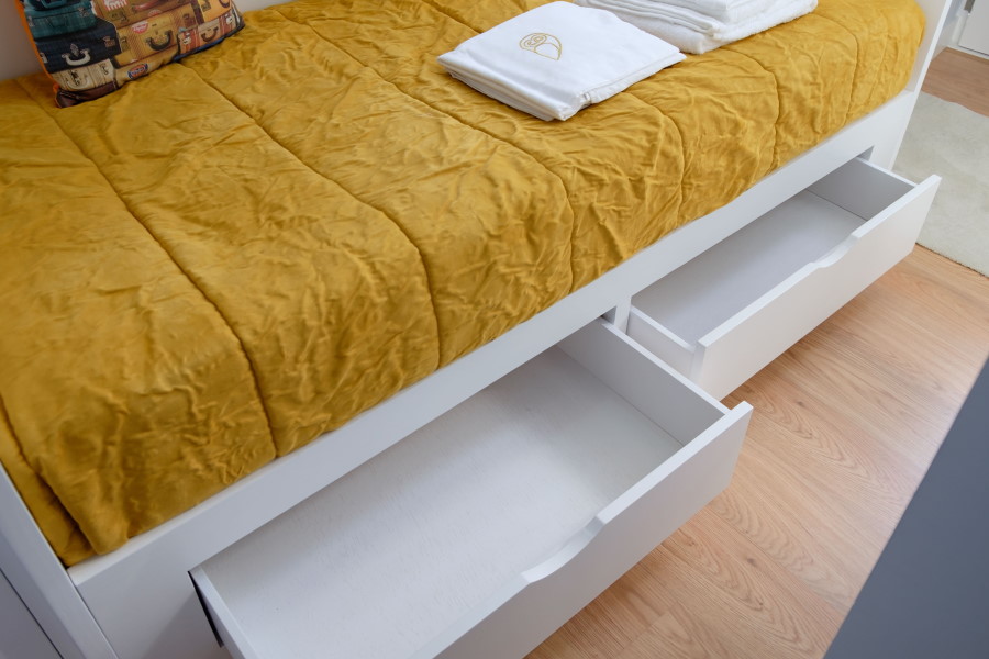 A cama é individual, com colchão ortopédico. Tem duas gavetas, um armário encastrado e um enorme baú, tudo previsto para facilitar a arrumação.
