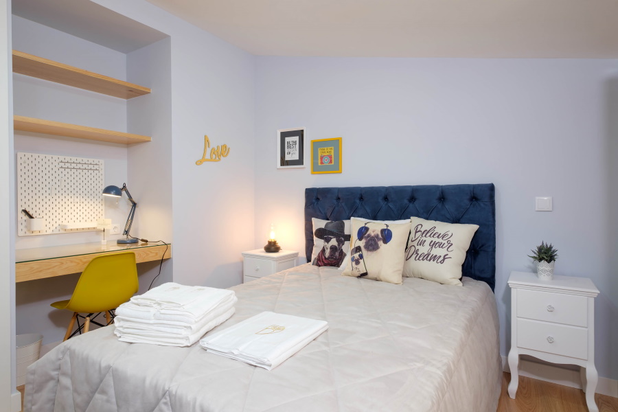 O Quarto tem uma janela com vista sobre a cidade – zona da universidade. A cama é de casal, com colchão ortopédico. Tem duas gavetas para arrumação. Duas românticas mesinhas de cabeceira, uma de cada lado da cama, servem de apoio. Tem um roupeiro espaçoso de duas portas.