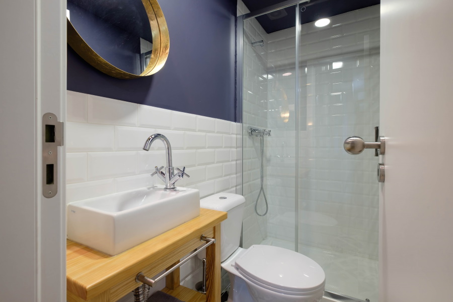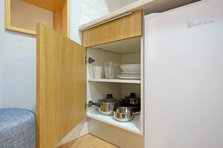 A Kitchenette pode ficar parcial ou totalmente “escondida” através de um sistema de persiana com decoração alusiva à cidade de Coimbra.