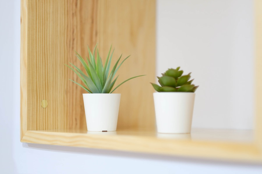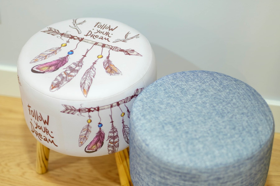 Nas paredes estão embutidos cubos de madeira natural, que para além de elementos decorativos, permitem a arrumação de livros e toda uma diversidade de objetos pessoais. A secretária feita à medida, tem duas prateleiras de madeira e uma cadeira estilo sueco. Tem um quadro de trabalho fixo na parede que lhe serve de apoio.