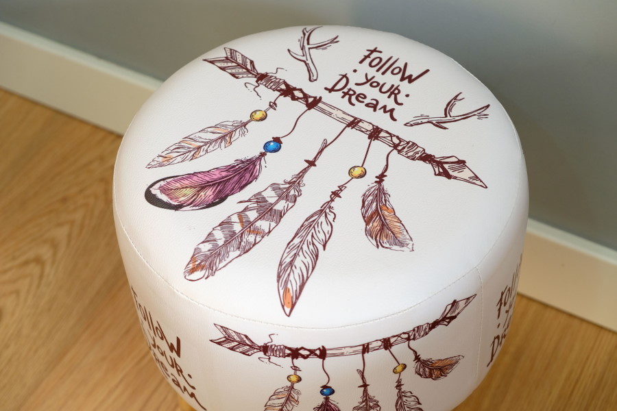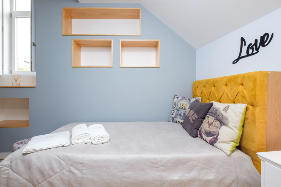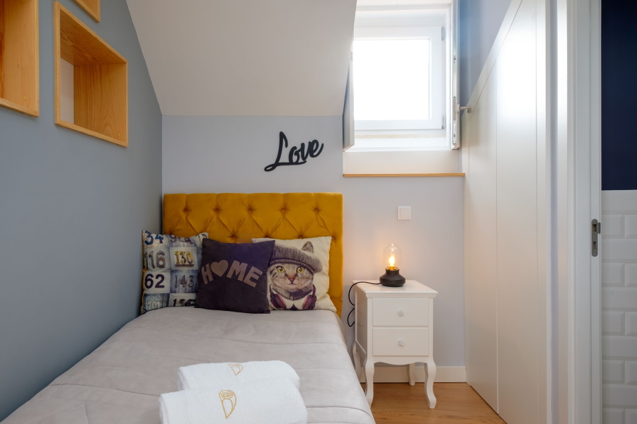 A cama é individual, com colchão ortopédico. Tem duas gavetas de arrumação. Uma romântica mesinha de cabeceira serve de apoio. O roupeiro é de duas portas.