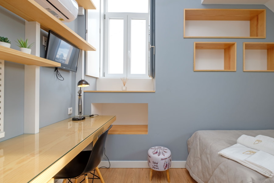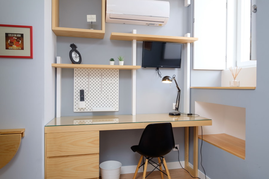 É um estúdio cheio de luz, tem duas janelas, uma de maiores dimensões voltada para o bonito pátio exterior e outra, mais pequena, com vistas sobre a cidade – zona da Universidade.