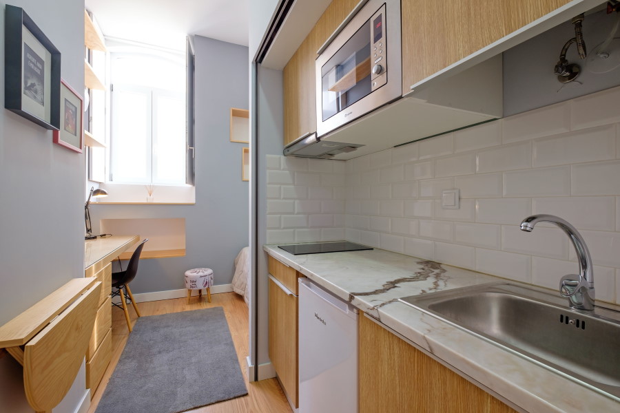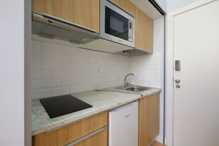 A Kitchenette pode ficar parcial ou totalmente “escondida” através de um sistema elétrico de persiana com decoração alusiva à cidade de Coimbra, basta carregar num interruptor.